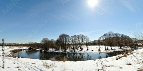 © Юрий Фатеев, Obraz premium Spring fishing on the Desna river. Beautiful panorama.