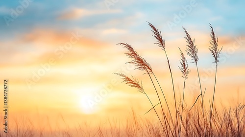 © nilawan, Fototapeta premium Spring flora in nature's landscape at sunrise captivating grass and sky view