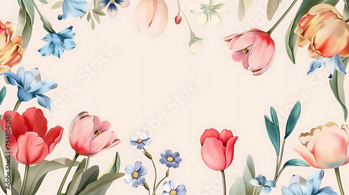 © Anastasiia, Naklejka premium Spring floral background with tulips and forget-me-nots