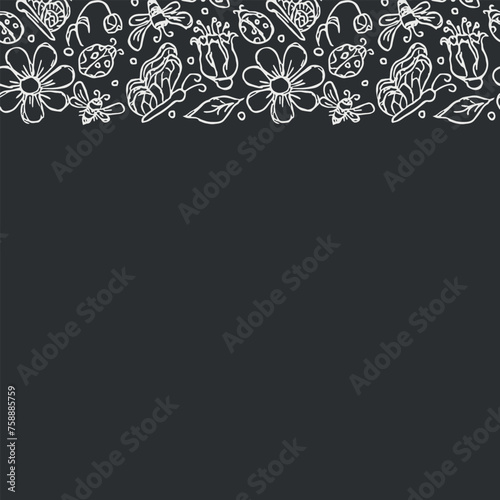 Fototapeta premium Spring floral frame with butterflies, bees and ladybugs. Seamless flowers background