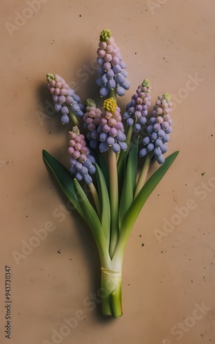 © Nikhil, Fototapeta premium Spring Floral Pattern Featuring Grape Hyacinth Muscari Flowers, Creating a Minimal Nature Still Life with a Blooming Purple Bouquet on a Beige Background