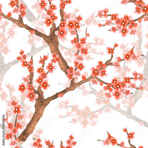 Obraz premium spring floral seamless pattern with flowering sakura in hand drawn watercolor...