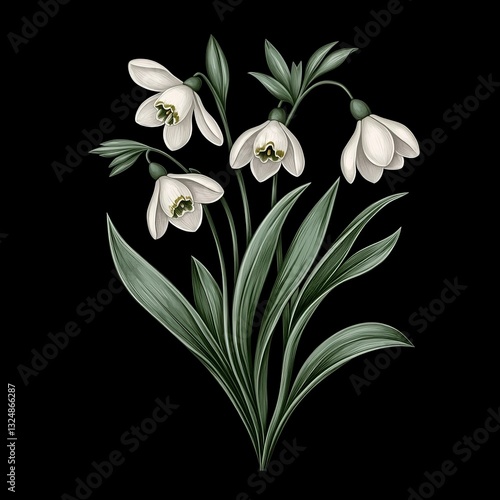 © Lalə, Fototapeta premium Spring flower snowdrop on black.
