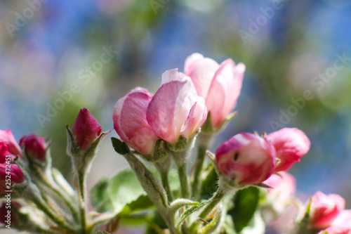 © subjob, Naklejka premium Spring flowering of apple and pear trees in the garden. Gardening and farm trees. white and pink flowers Stock background, photo