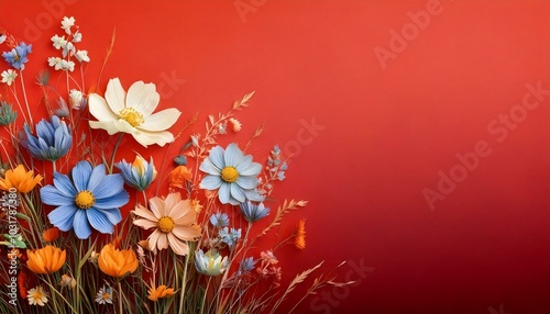 © Wat.Pt, Naklejka premium spring flowers background, pastel wildflowers, blue, gray, orange with space on the top for your text or design on soft tone