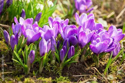Fototapeta premium Spring flowers. Bunch of crocus flowers in a garden