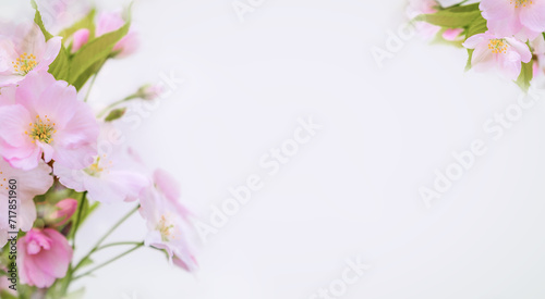 © myschka79, Fototapeta premium Spring flowers closeup on a white background copy space. Blossoming flowers of a fruit tree. Beautiful spring background, banner