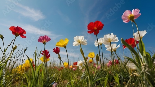 © Designer Khalifa, Fototapeta premium Spring flowers in the field with blue sky background