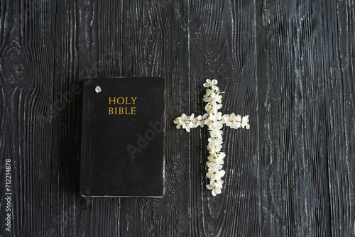 Obraz premium Spring flowers in the shape of a cross with a bible on an old wooden...