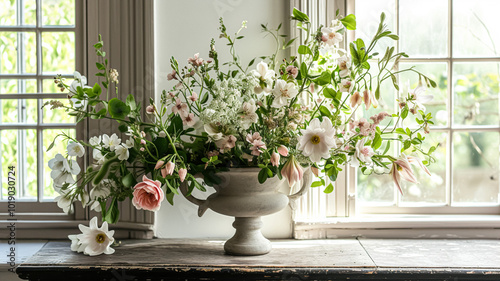 © ANNELEVEN, Fototapeta premium Spring flowers in vintage vase, beautiful floral arrangement, home decor, wedding and florist design