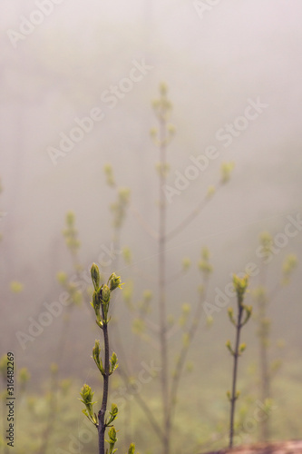 © Maslov Dmitry, Fototapeta premium spring foliage on a foggy morning in foreground