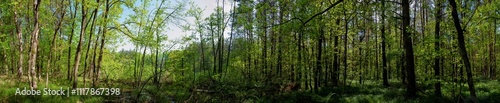 © mikhailgrytsiv, Fototapeta premium Spring forest and field on a background of blue sky