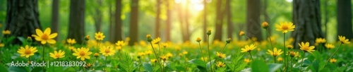 Obraz premium Spring forest awakens with yellow wildflowers blooming, leafy branches, bloom