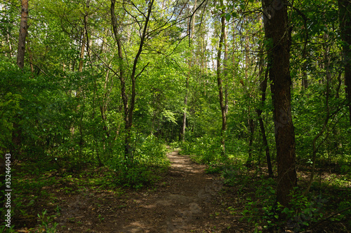 Obraz premium Spring forest, conifers and deciduous trees, roads. selective focus
