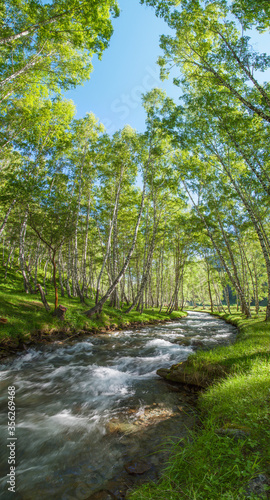 © Valerii, Fototapeta premium Spring forest creek, stormy stream. Vertical banner.
