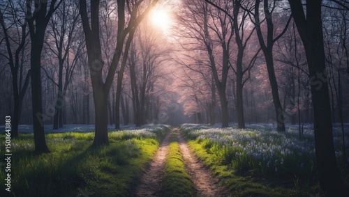 © Lasvu, Fototapeta premium Spring Forest illuminated by the bright sun. A path in the forest