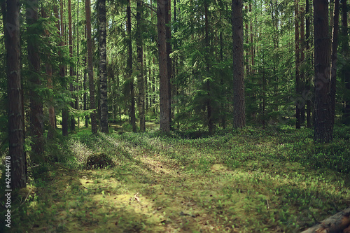© kichigin19, Fototapeta premium spring forest landscape, abstract fresh, seasonal nature view, green trees sun rays morning