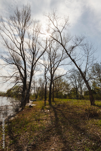 © dude_lea, Obraz premium Spring forest river landscape. Forest river in springtime. Fallen tree river forest scene