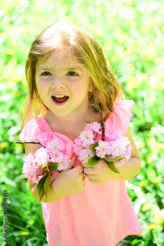 © Volodymyr, Fototapeta premium Spring freshness. Small child. Natural beauty. Childrens day. Springtime. weather forecast. Summer girl fashion. Happy childhood. Little girl in sunny spring. face and skincare. allergy to flowers
