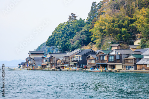 Naklejka premium 春の伊根の舟屋 京都府伊根町 Spring Funaya in Ine. Kyoto Pref, Ine town.
