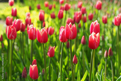 © ANGHI, Obraz premium Spring garden bathed in sunlight, a flowerbed of pink tulips