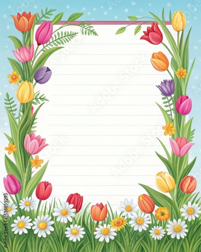 © Normal Desing, Obraz premium Spring garden flowers frame, colorful tulips and daisies.