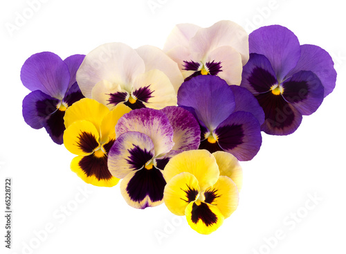 © Mushy, Fototapeta premium Spring garden flowers - pansies aka violas. Purple yellow