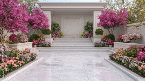 Fototapeta premium Spring garden, marble patio, blooming trees, calm background, serene...