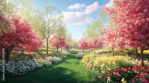 © Sanych, Naklejka premium Spring garden with blooming trees.