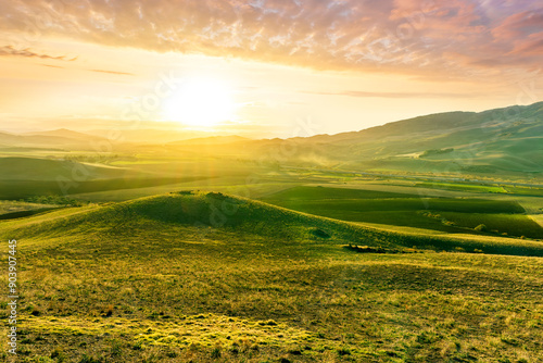 © Yaroslav, Fototapeta premium spring green field landscape in beautiful countryside with green and yellow grass, rural hills and amazing cloudy sky on background. Agriculture landscape with rural view