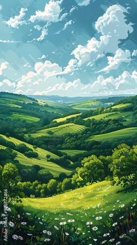© jinzhen, Obraz premium Spring green rural fields flat illustration poster background