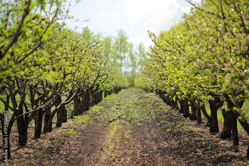 © alexeyborodin, Obraz premium Spring in apple orchard background. Row of blooming apple trees with green grass