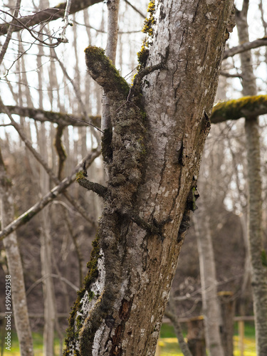 © Aija Freiberga, Obraz premium Spring in nature. Decorated Latvian nature walking trail, moss and tree decorations in the form of a lizard