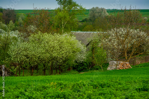 Obraz premium Spring in the countryside. Blooming tree in spring against the backdrop of...