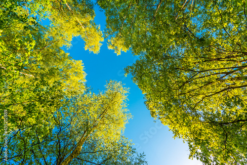 © Georgii Shipin, Fototapeta premium Spring in the deciduous forest. View of the tops of the trees in the sunlight from the ground level