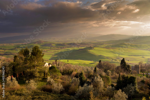 Fototapeta premium Spring in the fields of Tuscany in the sunset