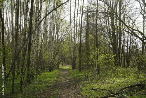 Obraz premium Spring in the forest. A path and trees with the first soft green leaves. Forest landscape.