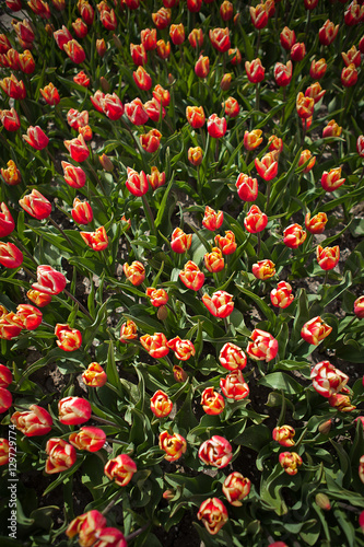 © Melanie, Fototapeta premium Spring in the Netherlands, ornage tulips field viewed from above