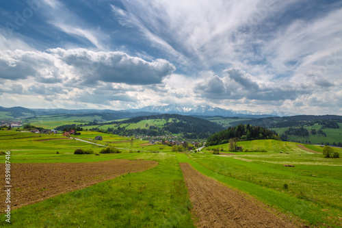 Fototapeta premium Spring in the Tatra Mountains. Green fields against the backdrop of snowy peaks. Landscape photo from Lesser Poland.