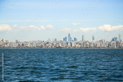 Fototapeta premium Spring, Istanbul view from the sea. Panorama of the city with a beautiful wave and clouds in the background . high-rise buildings, Turkey