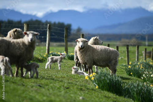 Fototapeta premium Spring lambs and sheep in a paddock of daffodils