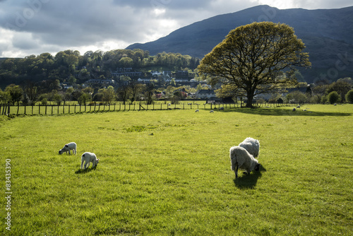 © veneratio, Obraz premium Spring lambs in sunlight in front of mountain in Lake District i