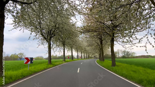 Fototapeta premium Spring landscape a road among blossoming cherry alley. Germany countryside