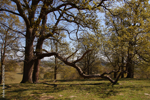 © Vicky, Obraz premium Spring landscape in the countryside with old oak tree with extended balancing branch