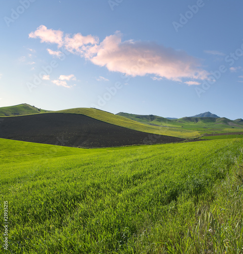 © ollirg, Fototapeta premium spring landscape of green grass and plowed land at the twilight