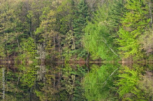 © Dean Pennala, Obraz premium Spring landscape of the shoreline of Hall Lake with mirrored reflections in calm water, Yankee Springs State Park, Michigan, USA