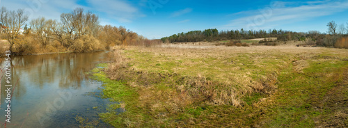 © pavlobaliukh, Fototapeta premium spring landscape panoramic view with river and meadow, early spring