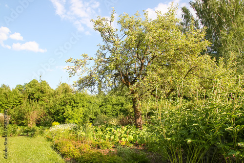 Obraz premium Spring landscape. Scenic view of green trees and meadows in a park in sunlight.
