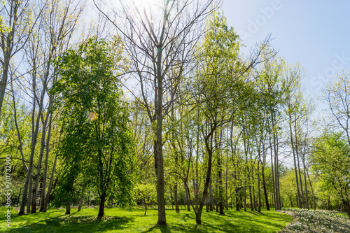 © kelifamily, Fototapeta premium Spring landscape.Trees in the park and sunlight shining through the tree branches