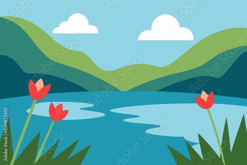 © Adi, Fototapeta premium Spring landscape with a field of flowers and green grass under a blue sky with clouds